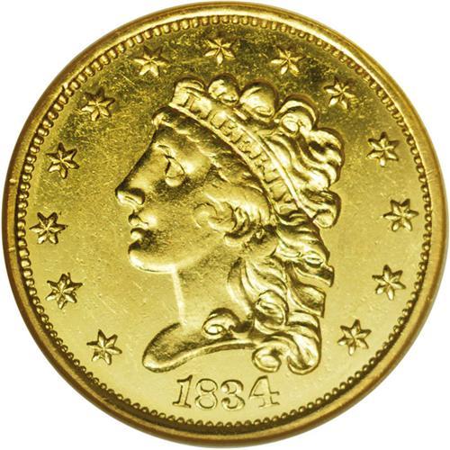 <B>1834<$2 1/2> Classic MS61 NGC.</B></I> McCloskey-B, Breen-6140, No Motto, Large Head, R.6. Boldly struck, if slightly weak in the centers, with pleasing luster and lovely yellow-green toning. A small number of wispy marks are evident on each side of the piece. An exceedingly scarce variety from the first year of the Classic Head quarter eagle design.