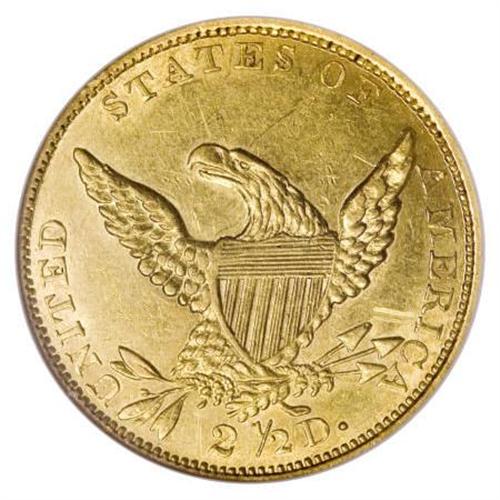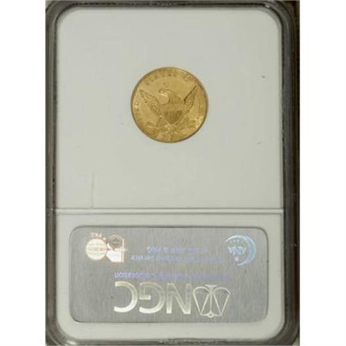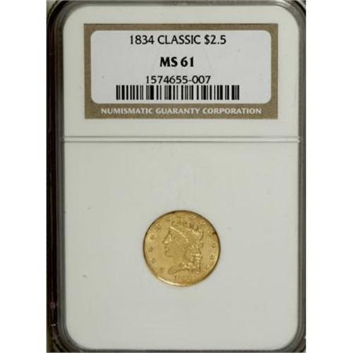 <B>1834 $2 1/2 Classic MS61 NGC.</B></I> Two obverse dies were utilized for the production of four different varieties, labeled Small Head and Large Head. Breen also called the Large Head obverse the "Booby Head." The Large Booby Head die is seen on this piece, with AM widely spaced on the reverse, identifying it as the common Large Head variety. Lustrous and sharp, the obverse has a couple darker toning spots and both sides have minor scrapes and scratches.<BR><BR><B>Coin Engraver:</B> William Kneass<BR><BR><b>Shipping:</b> Coins & Currency (<a target="_blank" href="http://www.heritageauctions.com/common/shipping.php">view shipping information</a>\)