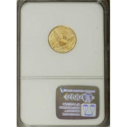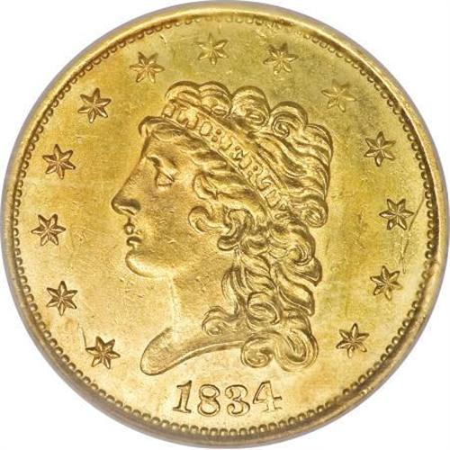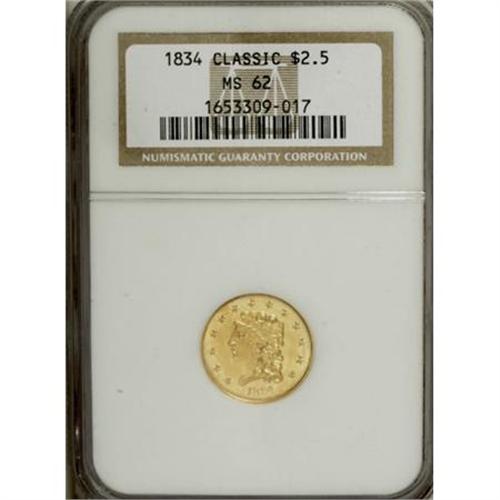 <B>1834 $2 1/2 Classic MS62 NGC.</B></I> The plentiful Small Head type is immediately identified by the straight vertical line of curls at the upper right part of Liberty, directly below from star 9. This is a remarkable piece with the first appearance of much higher quality. The grade is only limited by a small scratch near stars 11 and 12. The Small Head type is considered the first 1834 Classic Head quarter eagle coined, thus the first variety of the type.<BR><BR><B>Coin Engraver:</B> William Kneass<BR><BR><b>Shipping:</b> Coins & Currency (<a target="_blank" href="http://www.heritageauctions.com/common/shipping.php">view shipping information</a>\)