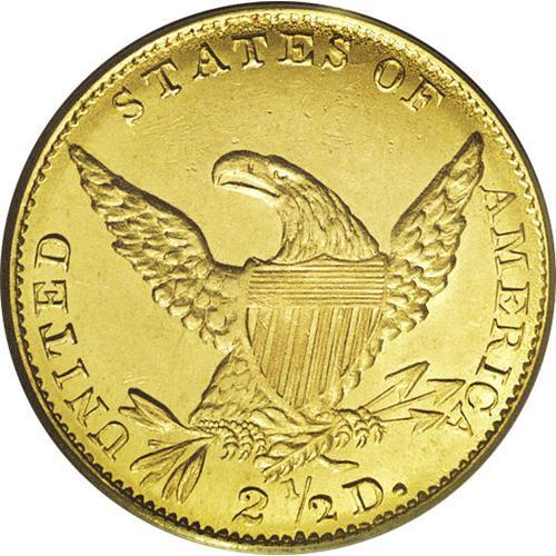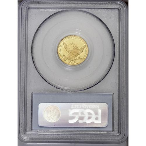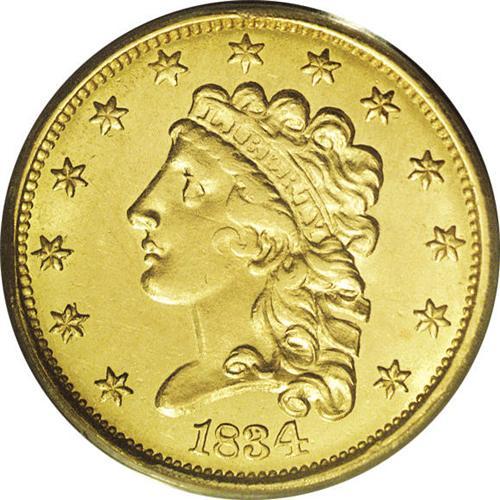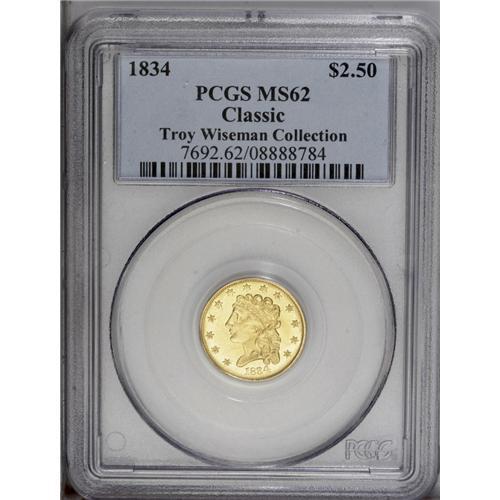 <B>1834<$2 1/2> Classic MS62 PCGS.</B></I> Breen-6140, Bass Reverse B, Large Head, R.6. This is Breen's Large or Booby Head style. The 4 in the date is large and extremely close to the curl. Liberty's jaw is jutting, and her lips are thick. The Bass Reverse A shows the A and M in AMERICA widely separated; the A is high and leans left. The Bass Reverse C has AME close, but the M is broken, missing its right diagonal, and the eagle has a tongue. On this Bass Reverse B variety--by far the rarest of the three--the eagle has no tongue and the AME in AMERICA is close, with M complete. Two other varieties are known. We estimate the rarity of this Reverse B variety at R.6, with perhaps a couple of dozen known examples. Our records show that this variety appears at auction much less frequently than either the Reverse A or C variants.<BR> This piece offers luscious and lustrous greenish-gold surfaces. A bit of light field chatter on each side accounts for the grade. The strike is somewhat soft on Liberty's highpoint hair and the left (facing) shield border, but fairly strong elsewhere. Gold specialists will recognize this coin for the "classic" opportunity that it is.<BR><I>From The Troy Wiseman Collection.</B></I>
