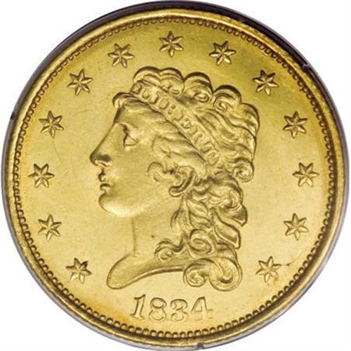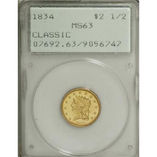 <B>1834 $2 1/2 Classic MS63 PCGS.</B></I> The Small Head variety, considered the first Classic Head quarter eagle minted in August of that year after the weight change of gold coinage took effect, is also the most common 1834 quarter eagle variety. This piece has highly lustrous yellow surfaces with scattered marks that are expected at the MS63 grade level. Population: 42 in 63, 46 finer (7/07).<BR><BR><B>Coin Engraver:</B> William Kneass<BR><BR><b>Shipping:</b> Coins & Currency (<a target="_blank" href="http://www.heritageauctions.com/common/shipping.php">view shipping information</a>\)
