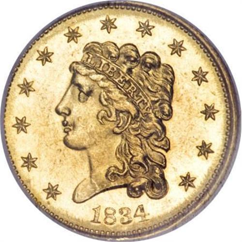 <B>1834 $2 1/2 Classic MS64 NGC. CAC.</B></I> Breen-6138, Small Head, R.1. Both sides are prooflike, as sometimes seen on this issue, although unrecognized by NGC on the encapsulation. While the obverse shows some light chatter in the fields as well as on the portrait of Liberty, the reverse is cleaner and appears high-end for the assigned grade. Both sides display the typical yellow-gold coloration usually seen, and the overall eye appeal of this piece is quite generous. While pieces by the hundreds of this issue have been certified in lower grades, at the MS64 level the NGC population is a scant 52 coins, with only 15 graded finer (1/08).<BR><I>From The Southwest Collection.</B></I><BR><BR><B>Coin Engraver:</B> William Kneass<BR><BR><b>Shipping:</b> Coins & Currency (<a target="_blank" href="http://www.heritageauctions.com/common/shipping.php">view shipping information</a>)