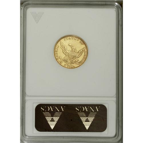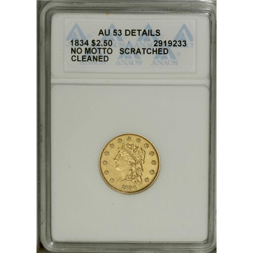 <B>1834 $2 1/2 Classic--Scratched, Cleaned--ANACS. AU53 Details.</B></I> Breen-6138, Small Head, R.2. The repunching on the first 2 in the denomination is clear on this early dies example. A sharply struck but hairlined piece with a couple of moderate marks on the field near the chin.<BR><BR><b>Shipping:</b> Coin/Currency (<a target="_blank" href="http://www.heritageauctions.com/common/shipping.php">view shipping information</a>)
