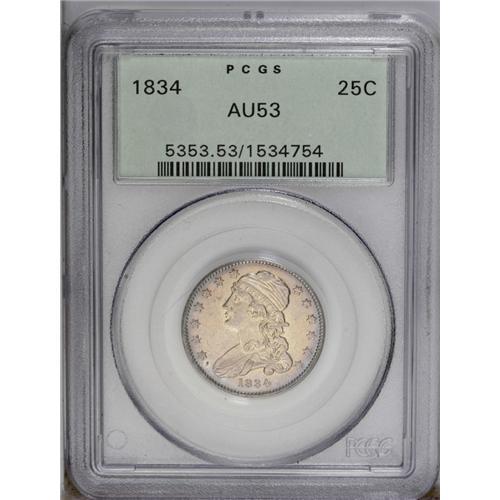 1834 25C AU53 PCGS. B-2, R.4. The scarcer "tongued eag 1834[25C] AU53 PCGS.