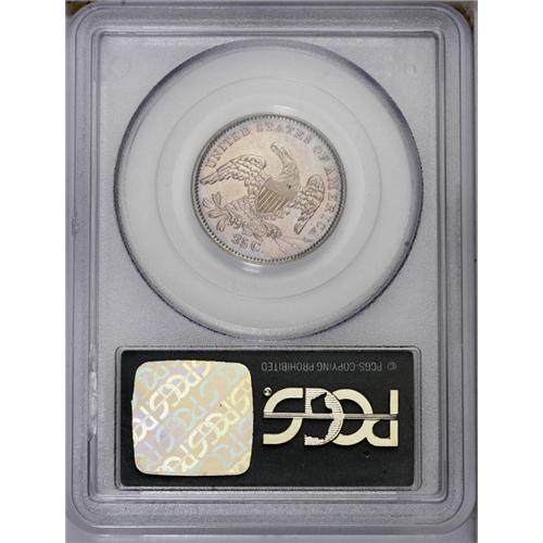 <B>1834<25C> AU53 PCGS.</B></I> B-2, R.4. The scarcer "tongued eagle" variety, also attributed by star 7 being recut. Much luster remains and both sides are lightly framed in blue and violet toning.