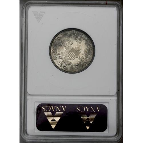 <B>1834<25C> AU55 ANACS.</B></I> B-1, R.1. The first star is far from the bust truncation, and there is no period after 25 C. Silvery-tan surfaces display luster in the recessed areas, and are exceptionally clean. Generally nice definition on the design elements, through some of the star centers are weak. A few wispy slide marks are mentioned for accuracy. The reverse is rotated clockwise about 20 degrees.