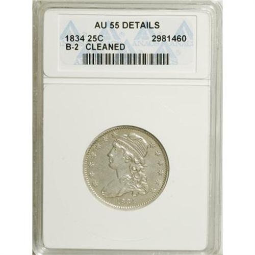<B>1834 25C --Cleaned--ANACS. AU55 Details.</B></I> B-2. NGC Census: (20/174). PCGS Population (30/134). Mintage: 286,000. Numismedia Wsl. Price for NGC/PCGS coin in AU55: $580. (#5353)<BR><BR><b>Shipping:</b> Coins & Currency (<a target="_blank" href="http://www.heritageauctions.com/common/shipping.php">view shipping information</a>)