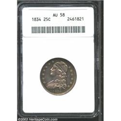<TABLE cellSpacing=0 cellPadding=0 width="100%" bgColor=#000000 border=0><TBODY><TR><TD width="100%"><TABLE cellSpacing=1 cellPadding=3 width="100%" border=0><TBODY><TR><TD width="100%" bgColor=#79735c><FONT face=arial color=#ffffff size=3><B>Description</B> </FONT></TD></TR><TR><TD width="100%" bgColor=#ffffff><FONT face=arial size=2><B>1834 25C AU58 ANACS.</B></I> B-3, R.3. Die crack across cap, mentioned in Reiver (1987) but not Breen (1992). Struck from a clashed obverse die. Aqua and gunmetal-gray patina. The devices are exquisitely defined and have only a trace of friction. An impressive Bust Quarter that has mildly prooflike luster. Accompanied by an old-time envelope with the written annotation "R. Picker 5-55." </FONT></TD></TR></TBODY></TABLE></TD></TR></TBODY></TABLE><BR><A name=PricesRealized></A><TABLE cellSpacing=0 cellPadding=0 width="100%" bgColor=#000000 border=0><TBODY><TR><TD width="100%"><TABLE cellSpacing=1 cellPadding=3 width="100%" border=0><TBODY><TR><TD width="100%" bgColor=#79735c><A name=PR><FONT face=arial color=#ffffff size=3><B>Previous Prices from Heritage Auctions</B> </FONT></A></TD></TR><TR><TD bgColor=#f6f6ed><TABLE cellSpacing=0 cellPadding=0 width="100%" border=1><TBODY><TR><TD align=middle width="33%"><B>Date</B></TD><TD align=middle width="33%"><B>Service</B></TD><TD align=middle width="33%"><B>Price</B></TD></TR><TR bgColor=whitesmoke><TD width="33%"><B>08/19/1995</B></TD><TD width="33%">PCGS</TD><TD width="33%">$632.50</TD></TR><TR bgColor=whitesmoke><TD width="33%"><B>04/16/2002</B></TD><TD width="33%">ANACS</TD><TD width="33%">$506.00</TD></TR><TR bgColor=whitesmoke><TD width="33%"><B>10/06/2001</B></TD><TD width="33%">ANACS</TD><TD width="33%">$603.75</TD></TR><TR bgColor=whitesmoke><TD width="33%"><B>10/04/1997</B></TD><TD width="33%">ANACS</TD><TD width="33%">$385.00</TD></TR></TBODY></TABLE></TD></TR><TR><TD bgColor=#ffffff><FONT face=arial size=1 ?>PLEASE NOTE: All prices realized reflect the final hammer price PLUS the buyer's premium in auctions that charge a buyer's premium. Each item has a notation at the top of the listing indicating whether that lot included a buyer's premium. Example: A item that sells with a final hammer price of $100 and a 20% buyer's premium will display with a price realized of $120. All information listed is intended to be as accurate as possible, but errors are possible. Please use this guide carefully and inform us of any inaccuracies. </FONT></TD></TR></TBODY></TABLE></TD></TR></TBODY></TABLE><BR><TABLE cellSpacing=0 cellPadding=0 width="100%" bgColor=#000000 border=0><TBODY><TR><TD width="100%"><TABLE cellSpacing=1 cellPadding=3 width="100%" border=0><TBODY><TR><TD width="100%" bgColor=#79735c colSpan=6><FONT face=arial color=#ffffff size=3><B>Price Guide*</B> </FONT></TD></TR><TR bgColor=#f6f6ed><TD align=middle><B>Grade</B> </TD><TD align=middle><B>Coin World<BR>(Trends)</B> </TD><TD align=middle><B>Numismedia<BR>Retail</B> </TD><TD align=middle><B>Numismedia<BR>Wholesale</B> </TD><TD align=middle><B>Coin<BR>Universe</B> </TD><TD align=middle><B>Heritage<BR>Value Index</B> </TD></TR><TR bgColor=#ffffff><TD align=middle>55</TD><TD align=right>$625.00</TD><TD align=right>$570.00</TD><TD align=right>$475.00</TD><TD align=right>$680.00</TD><TD align=right>$484.69</TD></TR><TR style="FONT-WEIGHT: bold" bgColor=#cccfdd><TD align=middle>58</TD><TD align=right>---</TD><TD align=right>$650.00</TD><TD align=right>$540.00</TD><TD align=right>---</TD><TD align=right>$499.93</TD></TR><TR bgColor=#ffffff><TD align=middle>60</TD><TD align=right>$800.00</TD><TD align=right>$920.00</TD><TD align=right>$765.00</TD><TD align=right>$775.00</TD><TD align=right>$555.00</TD></TR><TR bgColor=#ffffff><TD colSpan=6><FONT size=1>*All information listed is intended to be as accurate as possible, but errors are possible. No item may be returned or refused based on this information which is provided as a service to our customers. You should contact each pricing source directly to determine the accuracy of this information. </FONT></TD></TR></TBODY></TABLE></TD></TR></TBODY></TABLE><BR><TABLE cellSpacing=0 cellPadding=0 width="100%" bgColor=#000000 border=0><TBODY><TR><TD width="100%"><TABLE cellSpacing=1 cellPadding=3 width="100%" border=0><TBODY><TR><TD width="100%" bgColor=#79735c><FONT face=arial color=#ffffff size=3><B>Population Guide</B> </FONT></TD></TR><TR bgColor=#ffffff><TD align=middle><!-- Begin Output of Population Grid--><TABLE cellSpacing=0 cellPadding=0 width="100%" border=0><TBODY><TR><TD vAlign=center><TABLE cellSpacing=0 width="100%" border=1 cellsadding="3"><TBODY><TR><TD vAlign=center><TABLE cellSpacing=0 cellPadding=3 width="100%" border=1><TBODY><TR><TD vAlign=center align=middle bgColor=#f0f1e8 colSpan=2 <CENTER><FONT face=Arial size=2><B>PCGS Pop </B></FONT><CENTER></CENTER></TD><TD vAlign=center align=middle bgColor=#f0f1e8 colSpan=2><CENTER><FONT face=Arial size=2><B>NGC Pop</B></CENTER></FONT></TD></TR><TR><TD vAlign=center><FONT face=Arial size=2>(58)</FONT> </TD><TD vAlign=center align=right><FONT face=Arial size=2>23</FONT> </TD><TD vAlign=center><FONT face=Arial size=2>(58)</FONT> </TD><TD vAlign=center align=right><FONT face=Arial size=2>34</FONT> </TD></TR><TR><TD vAlign=center><FONT face=Arial size=2>(>58)</FONT> </TD><TD vAlign=center align=right><FONT face=Arial size=2>78</FONT> </TD><TD vAlign=center><FONT face=Arial size=2>(>58)</FONT> </TD><TD vAlign=center align=right><FONT face=Arial size=2>109</FONT> </TD></TR></TBODY></TABLE></TD></TR></TBODY></TABLE></TD></TR></TBODY></TABLE><!-- End Output of Population Grid--> Important notice: Heritage usually auctions material at the rate of 200-250 lots per hour. On some occasions eBay Live bid software or the Internet may not be able to keep up with the pace of the auction. We recommend placing a realistic absentee bid now as insurance to avoid disappointment. Occasionally the auctioneer may eliminate or reject an eBay Live bid, and the auctioneer may 