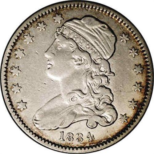 <B>1834<25C> B-1, R.1--Reverse Scratched--NCS. VF Details. Die State I.</B></I> Star 7 repunched; Two lined stripes. Cleaned with an abrasive long ago and now slightly dull. The centers are silvery-gray with a touch of gold around the periphery. Sharply struck and an early die state. We note a few minor scrapes on the reverse, mostly below the left wing. Envelope Included.