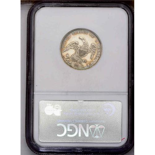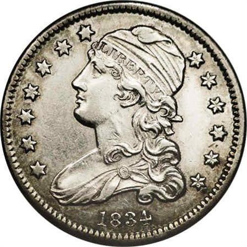 <B>1834<25C> B-4, R.1. AU58 NGC. Die State II.</B></I> Star 8 repunched; Stem ends over center of C. Bright silver-gray with a blush of gold and blue on the periphery. Lustrous in the fields and fairly sharp despite meandering die cracks through the reverse legends.<BR><I>Ex: Heritage (3/1984).</B></I> Envelope Included.