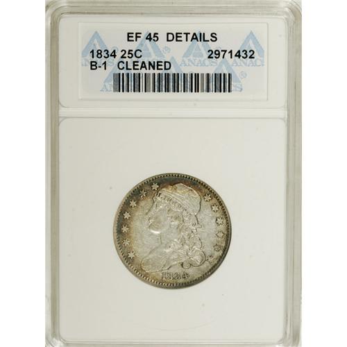 <B>1834 25C --Cleaned--ANACS. XF45 Details.</B></I> B-1. NGC Census: (86/448). PCGS Population (44/217). Mintage: 286,000. Numismedia Wsl. Price for NGC/PCGS coin in XF45: $368. (#5353)<BR><BR><b>Shipping:</b> Coins & Currency (<a target="_blank" href="http://www.heritageauctions.com/common/shipping.php">view shipping information</a>)