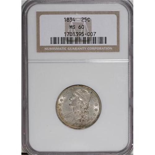 <B>1834 25C MS60 NGC.</B></I> B-4, R.1. The first star is close to the bust, and a large gap appears between OF and AMERICA. This strongly lustrous, well-defined piece has silver-white centers with elements of reddish-gold at the margins. The surfaces show few overt abrasions, though wispy flaws are prevalent.<BR><BR><B>Coin Engraver:</B> William Kneass<BR><BR><b>Shipping:</b> Coins & Currency (<a target="_blank" href="http://www.heritageauctions.com/common/shipping.php">view shipping information</a>)