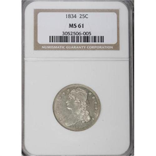 <B>1834 25C MS61 NGC.</B></I> B-1, R.1. The "No Period" variety, an engraving error since the period after the C (for CENTS) was part of the design. Silver-gray surfaces display well struck design features, save for softness in the star centers at the left border.<BR><BR><B>Coin Engraver:</B> William Kneass<BR><BR><b>Shipping:</b> Coins & Currency (<a target="_blank" href="http://www.heritageauctions.com/common/shipping.php">view shipping information</a>)