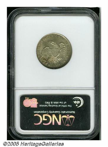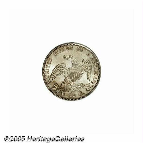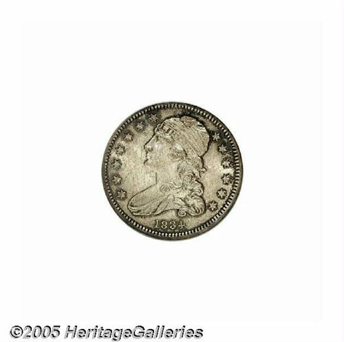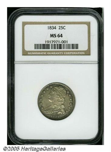 <B>1834<25C> MS64 NGC.</B></I> B-4, R.1. Honey-gold and pearl-gray colors embrace this highly lustrous and exquisitely struck near-Gem. An undisturbed and impressive piece that would fit well within a Gem quality type set. A solitary faint vertical roller mark (as made) passes through the 1 in the date. Wispy die cracks (as produced) traverse much of the reverse periphery.