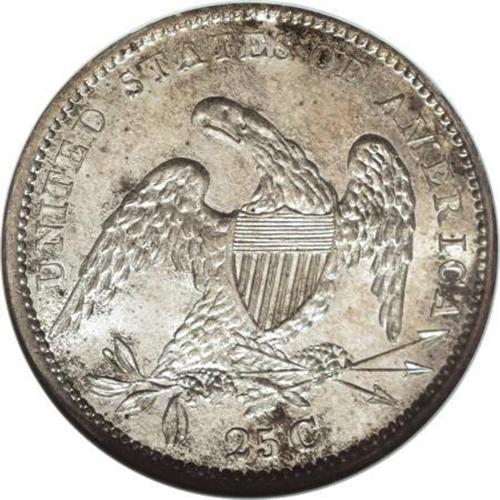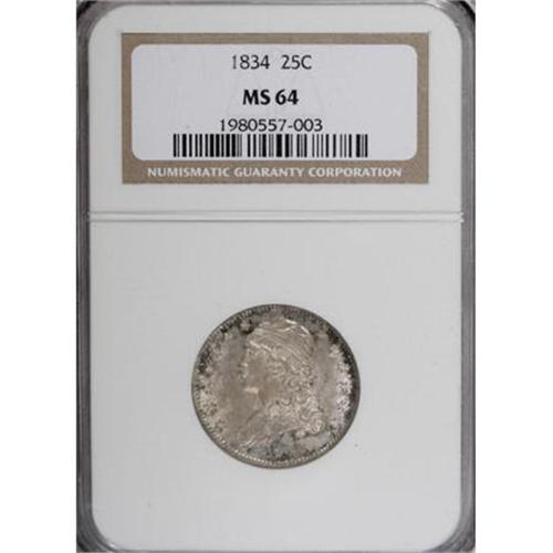 <B>1834 25C MS64 NGC.</B></I> B-1, R.1. Characterized by star 1 that is far from the bust truncation, and there is no period after 25 C. The mint luster is bright and exceptionally lustrous with a hazy overlay of oyster-gray and reddish patina that deepens around the margins. The striking details are remarkably strong throughout, and the only marks of note are in the right obverse field. An outstanding Bust quarter. Census: 28 in 64, 13 finer (10/07).<BR><BR><B>Coin Engraver:</B> William Kneass<BR><BR><b>Shipping:</b> Coins & Currency (<a target="_blank" href="http://www.heritageauctions.com/common/shipping.php">view shipping information</a>)