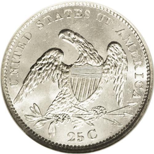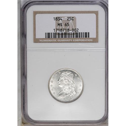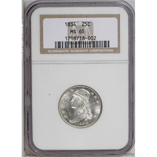 <B>1834<25C> MS65 NGC.</B></I> B-1, R.1. A spectacular Gem that has dazzling luster and untoned surfaces. The strike is razor-sharp, and the surfaces are gorgeously preserved. An outstanding type coin that worthy of the finest collection. While Browning-1 is not a rare variety, it has several interesting features. No period follows 25C. The eagle's left (facing) claw has a pair of extra, unattached talons. A mint-made spine extends from one of the leaves on the olive branch. A series of tiny lumps (struck from a rusted die) are noted in the field above the eagle's head. The dies are rotated clockwise approximately 45 degrees. Census: 8 in 65, 5 finer (7/06).