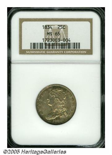 <B>1834<25C> MS65 NGC.</B></I> B-2, R.3. Apricot and powder-blue hues enliven each side. Full cartwheel luster and a pinpoint-sharp strike demonstrate the quality of this impressive high grade type coin. The reverse is especially well preserved. Worthy of the finest quality early silver type set. Population: 8 in 65, 5 finer (4/05).