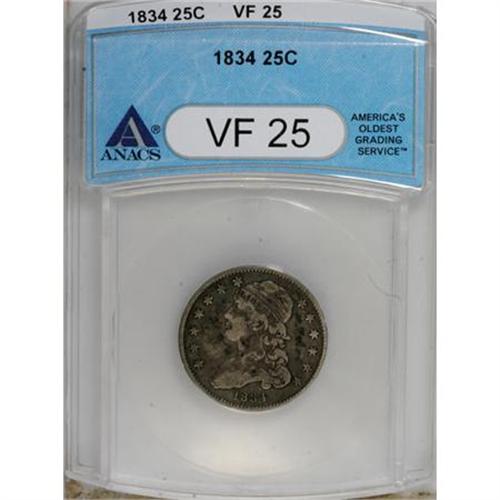 <B>1834 25C VF25 ANACS.</B></I> NGC Census: (6/310). PCGS Population (10/322). Mintage: 286,000. Numismedia Wsl. Price for NGC/PCGS coin in VF25: $127. (#5353)<BR><BR><B>Coin Engraver:</B> William Kneass<BR><BR><b>Shipping:</b> Coins & Currency (<a target="_blank" href="http://www.heritageauctions.com/common/shipping.php">view shipping information</a>\)