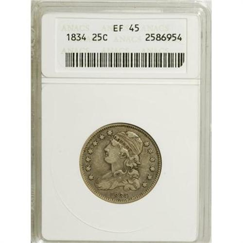 <B>1834 25C XF45 ANACS.</B></I> NGC Census: (43/224). PCGS Population (44/217). Mintage: 286,000. Numismedia Wsl. Price for NGC/PCGS coin in XF45: $368. (#5353)<BR><BR><b>Shipping:</b> Coins & Currency (<a target="_blank" href="http://www.heritageauctions.com/common/shipping.php">view shipping information</a>)