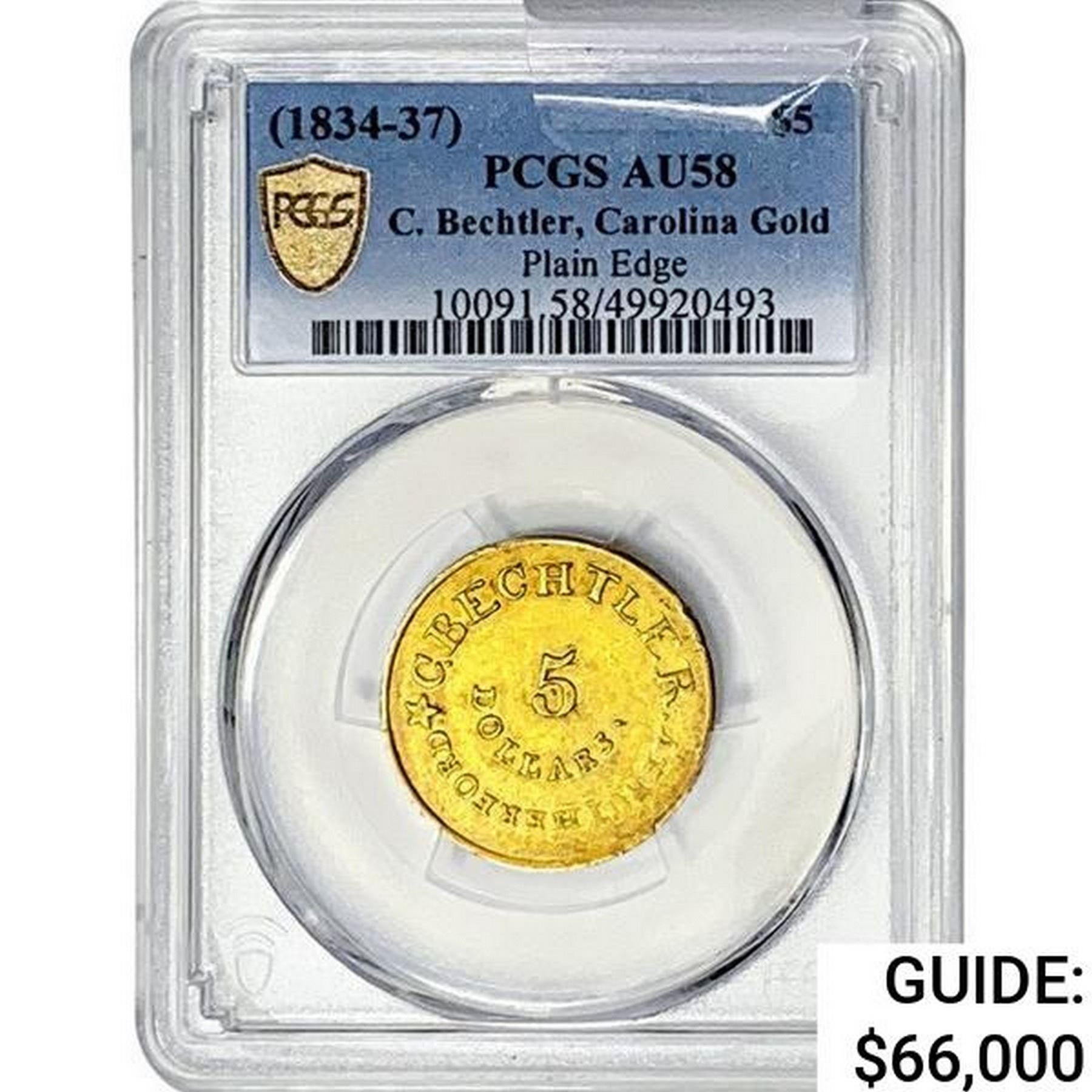 1834-37 $5 C.Bechtler Carolina G PCGS AU58 Plain Edge