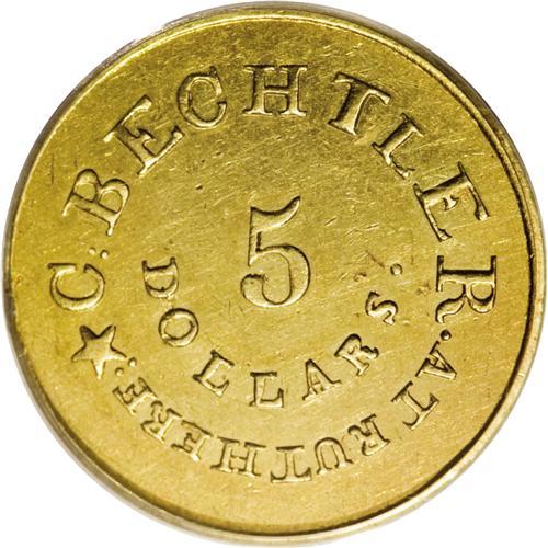 <B>(1834-37) $5 C. Bechtler Five Dollar, 20 Distant AU50 PCGS.</B></I> K-19, High R.6. A pleasing example of this Bechtler variety. The olive-gold surfaces have an overlay of light reddish color in the fields. The dies are rotated clockwise by more then 180 degrees. Lightly marked with no distinctive blemishes on either side, this is an impressive high-end example of this rare issue. Listed on page 346 of the 2007 <I>Guide Book.</B></I><BR><BR><b>Shipping:</b> Coins & Currency (<a target="_blank" href="http://www.heritageauctions.com/common/shipping.php">view shipping information</a>)