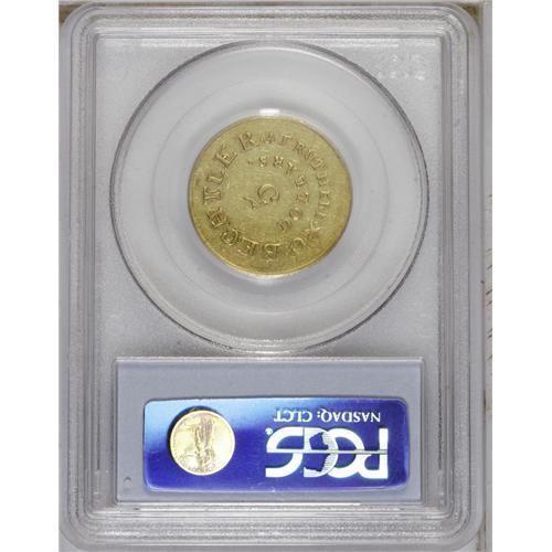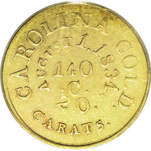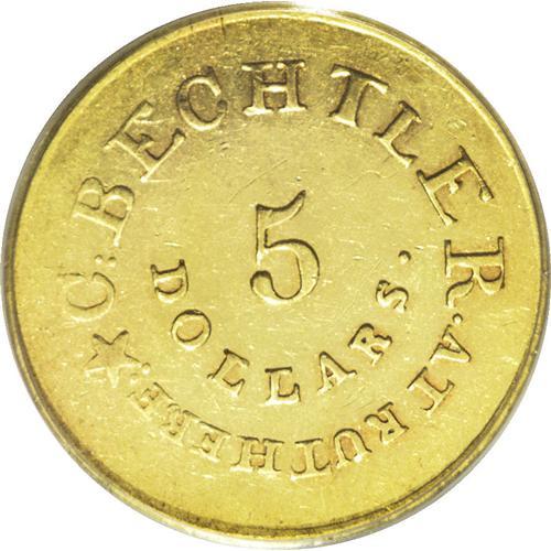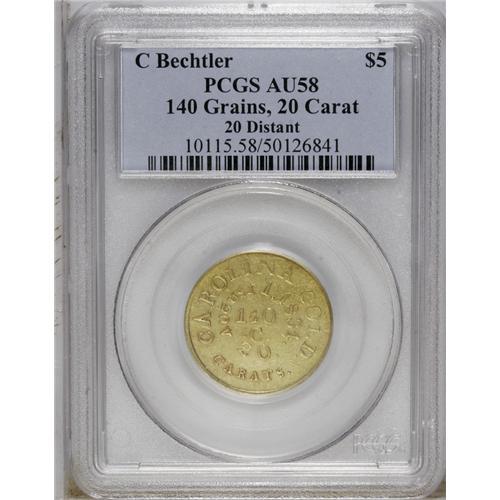 <B>(1834-37) $5 C.Bechtler Five Dollar, 20 Distant AU58 PCGS.</B></I> K-19, High R.6. A rare variety with the 20 distant from the word CARATS on the lower reverse. The obverse on this variety was later used to coin the rare proof restrikes. The surfaces are lightly marked with the signs of handling one would expect from two points of circulation with the most obvious abrasions in the center of each side. The surfaces are a light green-golden color with ample luster remaining in the protected areas. An impressive example of this scarce variety. Tied with one other piece for the honor of finest PCGS-certified (10/06). Listed on page 346 of the 2007 <I>Guide Book.</B></I><BR><BR><b>Shipping:</b> Coin/Currency (<a target="_blank" href="http://www.heritageauctions.com/common/shipping.php">view shipping information</a>)