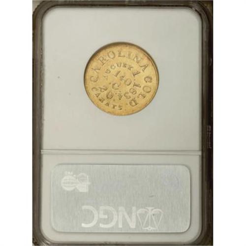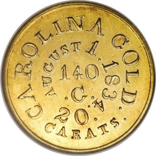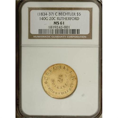 <B>(1834-37) $5 C. Bechtler Five Dollar, 140G. 20C, RUTHERFORD. MS61 NGC.</B></I> K-17, R.5. Don Kagin, in his important reference on Territorial gold, identified this variety as the marriage of Obverse 2 with Reverse D. This plain edge issue is quickly identified by the die chip found within the lower loop of the 5 in the denomination (reverse) and, although Reverse D is also paired with two other obverse dies, only K-17 reflects the weight as 140 grains.<BR> This well struck example displays attractive copper-gold coloration on semiprooflike fields, which are normal to the issue, but slightly more pronounced here than on most examples. Minor hairlines on either side account for the assigned grade, yet they do not detract from the overall eye appeal of this specimen. An eye-appealing early Territorial that is rare in this state of preservation. Listed on page 350 of the 2008 <I>Guide Book</B></I>. Census: 8 in 61, 4 finer, for the entire subtype (12/07).<BR><BR><b>Shipping:</b> Coins & Currency (<a target="_blank" href="http://www.heritageauctions.com/common/shipping.php">view shipping information</a>)