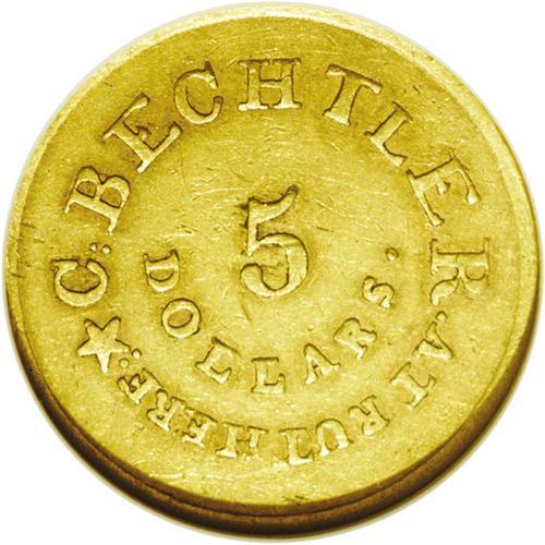 <B>(1834-37)<$5> C.Bechtler Five Dollar, RUTHERF: AU58 NGC.</B></I> Kagin-23, High R.6. Although this variety has the lowest rarity rating of all the Georgia Gold five dollar coins, it is still an important rarity in the series. Only a few more than a dozen examples are known. Pleasing, lustrous surfaces have attractive green-gold color with traces of orange patina. Minor hairlines and other light abrasions are noted, but none are of major significance. Listed on page 346 of the 2006 <I>Guide Book.</B></I> <BR><BR><B>Important notice:</B> Heritage usually auctions material at the rate of 200-250 lots per hour. On some occasions eBay Live bid software or the Internet may not be able to keep up with the pace of the auction. We recommend placing a realistic absentee bid now as insurance to avoid disappointment. Occasionally the auctioneer may eliminate or reject an eBay Live bid, and the auctioneer may also reopen a lot after the close of the eBay live bidding (usually because we missed an audience bid), and may reject your bid even if it shows you as the winning bidder. By bidding via eBay Live, you agree that Heritage may award the lot to another bidder at its sole discretion under the circumstances described above or any other reasonable circumstances. Since eBay bids are not shown to us until we open the lot on the floor, we treat those bids just like floor bids. In most cases the floor responds before the eBay bid is presented to us, due to Internet lag time, so for consistency we have made it a policy that floor bids are always considered first over tie eBay live bids. Also please note that all Heritage lots purchased through eBay Live carry a 20% Buyer's Premium. Please make sure you read the Terms and Conditions before you bid. This lot is being auctioned in conjunction with a live floor auction by Heritage Galleries & Auctioneers. All final auction and invoice information will be supplied by Heritage Galleries & Auctioneers, and all other information should be considered preliminary. Lot:4762 <BR><BR><B>Winning Notification and Billing:</B> After the FINAL session in this auction is complete, Heritage will send e-mail and snail mail invoices. This process normally takes several days. All final auction and invoice information will be supplied by Heritage Galleries & Auctioneers, and all other information should be considered preliminary. <BR><BR>This auction will be conducted on a live auction floor and over the Internet through eBay Live. If you choose to place an absentee bid, please take a moment to <font color='#0000ff'><u><a href='http://pages.ebay.com/liveauctions/help/before/laabsentee.html'>learn how eBay Live absentee bidding works</a></u></font><font color='#000000'>