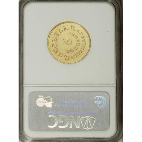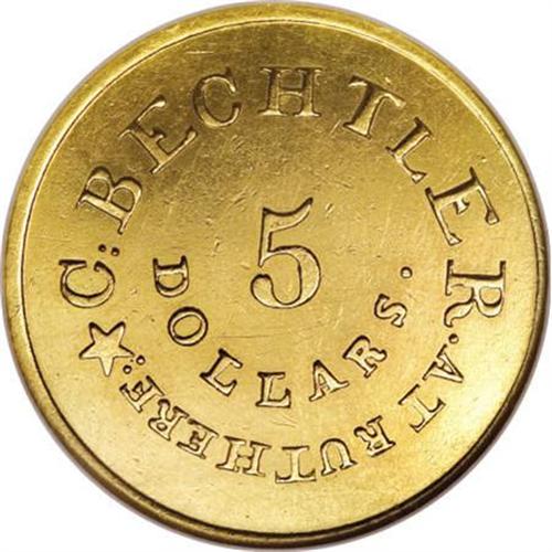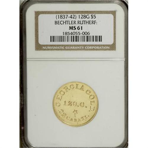 <B>(1834-37) $5 C. Bechtler Five Dollar, RUTHERF: MS61 NGC.</B></I> K-23, R.6. This is an impressive Mint State example of the Georgia Gold rarity. This example was assigned the High Rarity-6 rating by Donald Kagin's in his 1981 reference, <I>Private Gold Coins and Patterns of the United States. </B></I>Although a few more are probably known today, a quarter century later, it is doubtful that this variety has broken out of the R.6 level, thus less than 30 examples exist.<BR> This example is the first Mint State specimen that we have handled in any of our auctions since we began our archives in 1993. NGC and PCGS have combined to grade just three MS-61 examples with one finer piece (6/07). This specimen has bright greenish-yellow gold with considerable reflectivity in the fields. Logically, since it is made from Georgia Gold, it has a similar color to most Dahlonega Mint gold pieces. Listed on page 350 of the 2008 <I>Guide Book</B></I>.<BR><I>From The Stephen L. Schechter Collection of Bechtler Territorial Gold.</B></I><BR><BR><b>Shipping:</b> Coins & Currency (<a target="_blank" href="http://www.heritageauctions.com/common/shipping.php">view shipping information</a>)