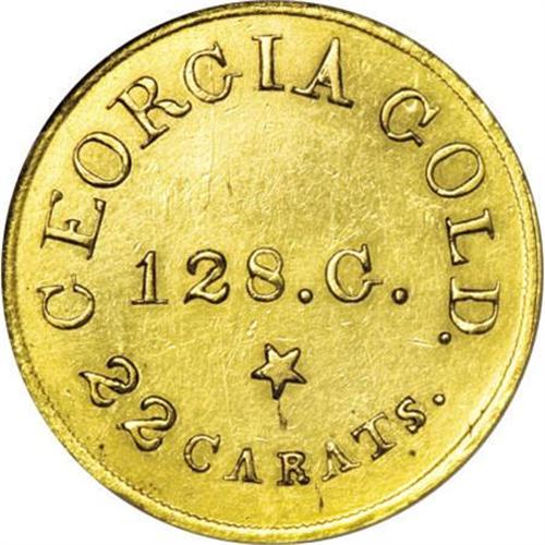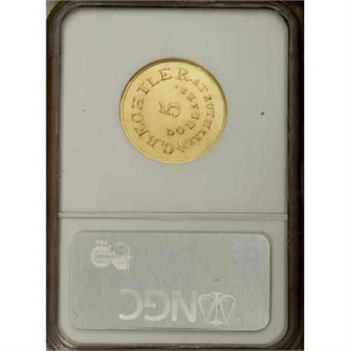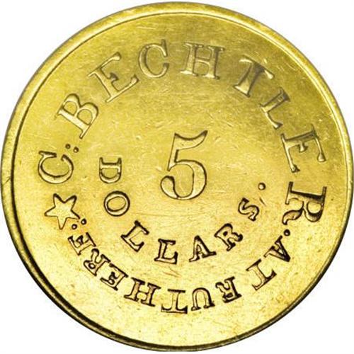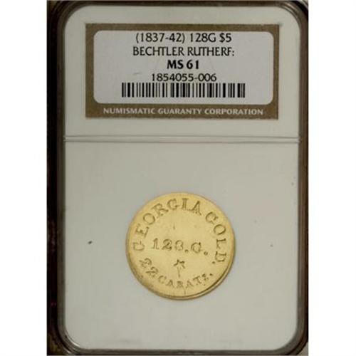 <B>(1834-37) $5 C. Bechtler Five Dollar, RUTHERF: MS61 NGC.</B></I> K-23, R.6. This is an impressive Mint State example of the Georgia gold rarity. This example was assigned the High Rarity-6 rating by Donald Kagin in his 1981 reference, <I>Private Gold Coins and Patterns of the United States. </B></I>Although a few more are probably known a quarter century later, it is doubtful that this variety has broken out of the R.6 level, thus less than 30 survivors exist.<BR> This example is the first Mint State specimen that we have handled in any of our auctions since we began our archives in 1993. NGC and PCGS have combined to grade just three MS61 examples with one finer piece (11/07). This specimen has bright greenish-yellow gold with considerable reflectivity in the fields. Logically, since it is made from Georgia Gold, it has a similar color to most Dahlonega Mint gold pieces. Listed on page 350 of the 2008 <I>Guide Book</B></I>.<BR><I>From The Madison Collection.</B></I><BR><BR><b>Shipping:</b> Coins & Currency (<a target="_blank" href="http://www.heritageauctions.com/common/shipping.php">view shipping information</a>)