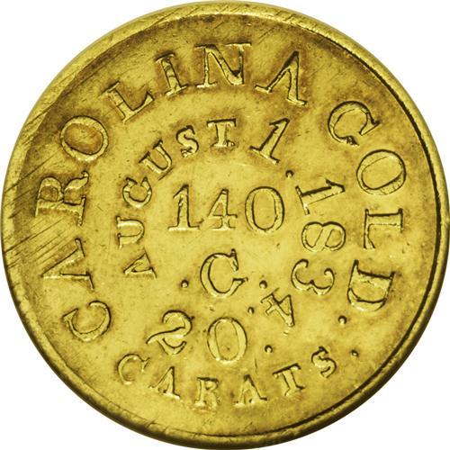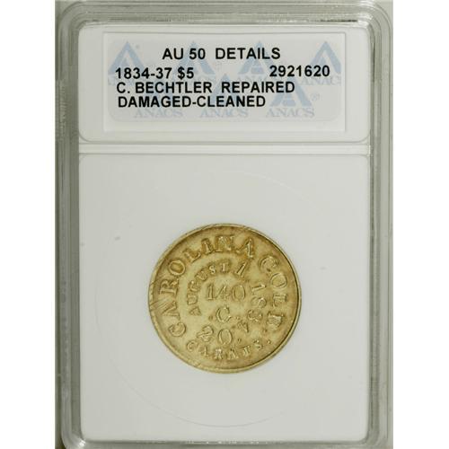 <B>1834 $5 C.Bechtler Five Dollar, 140 G., RUTHERFORD, Plain Edge--Repaired, Damaged, Cleaned--ANACS. AU50 Details.</B></I> K-17, R.5. Repaired beneath the prominent 5, and above the RU in RUTHERFORD. The right reverse field is hairlined, and a lamination streak crosses the central reverse. The upper left obverse displays a few roller marks. A rare Bechtler gold variety. Listed on page 346 of the 2007 <I>Guide Book.</B></I><BR><BR><b>Shipping:</b> Coin/Currency (<a target="_blank" href="http://www.heritageauctions.com/common/shipping.php">view shipping information</a>)