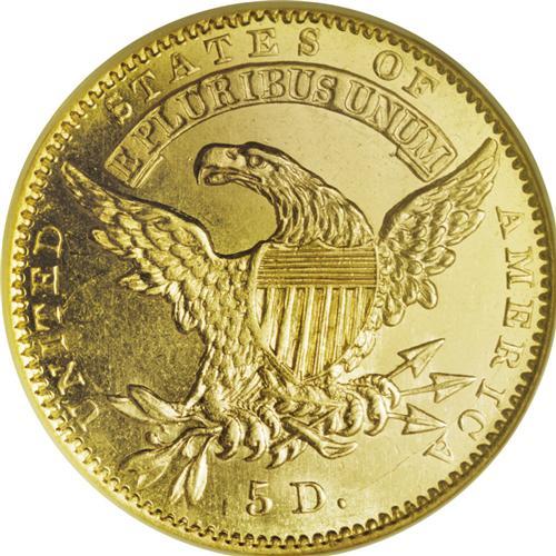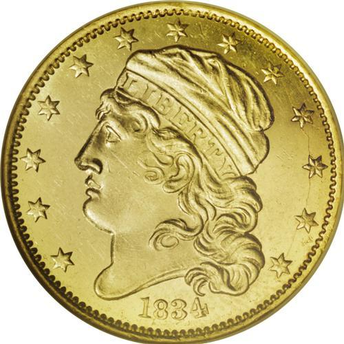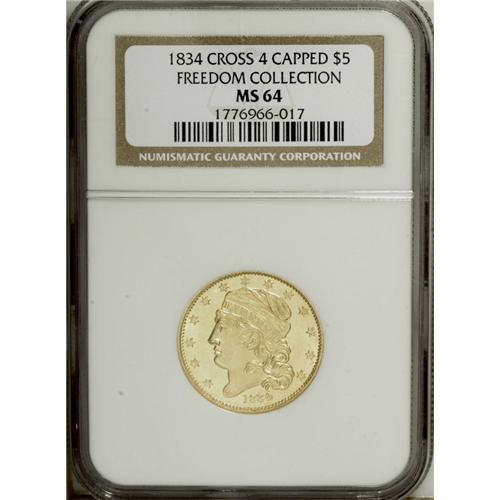 <B>1834 $5 Capped Head, Crosslet 4 MS64 NGC.</B></I> B. I-3, Breen-6500, Bass-3166, BD-2, R.5. The final "old tenor" design type was coined from 1829 through early 1834, with few surviving examples. Although Mint records suggest that over 700,000 of these coins were produced from 14 different die combinations, the total estimated population today is less than 400 coins with a cumulative total of 284 to 370 pieces according to John Dannreuther, including 80 to 100 examples of this date alone. Some numismatists will be surprised to learn that the 1834 With Motto half eagle is the most plentiful date of this design type.<BR> The actual mintage figures have no relationship to the rarity of these pieces today. Newly minted half eagles during the 1820s and early 1830s were immediately worth a premium, and were hoarded and melted in this country, or exported. In the <I>Harry W. Bass, Jr. Sylloge,</B></I> Dave Bowers relates: "Beginning by the autumn of 1821, virtually all half eagles were exported, a situation that remained in effect through the summer of 1834. Even the Philadelphia Mint would pay a premium over face value for contemporary half eagles! Thus, striking was specifically to the order of bullion depositors who realized that a freshly-minted $5 would be worth more than face value, and that on the international market it could be exchanged for its bullion value. At foreign destinations such as London and Paris, American half eagles would be melted and converted into national coinage--to facilitate exchange, accounting, and trade. Although hundreds of thousands of Type IV 1813-1829, Type V was issued from 1829-1834 half eagles were struck, only a few survived exportation and subsequent melting. Thus, the general mintage figures in no way relate to the availability of such pieces today."<BR> The Coinage Act dated June 28, 1834 reduced the authorized weight of half eagles to 129 grains of standard 899.2 fine gold. The previous standard had been 135 grains of 916.7 fine gold. These standards yielded a gold value of $5.33 for the old standard pieces. The new standard, accompanied by the new Classic Head design, took effect on August 1, 1834. It is fascinating to learn that the most prolific private gold manufacturer in the country at that time, Christian Bechtler, adapted the new standard to his coinage as well. In fact, one of the Bechtler five dollar gold pieces actually includes the August 1, 1834 date as part of the design. The Bechtler piece actually contains 116.67 grains of pure gold instead of 116 grains, about three cents worth of extra gold at the time.<BR> Although the 1979 photograph makes plate matching difficult, we are quite certain that this example piece is from the famous Garrett Collection, sold on behalf of Johns Hopkins University by Bowers and Ruddy in a series of four sales from 1979 to 1981. A tiny rim bruise directly above star 7 appears to match the photo of the Garrett coin. Despite a few insignificant abrasions, this is a lovely example with bright greenish yellow-gold color and full prooflike surfaces. The obverse has a die crack joining stars 9 through 13. John Dannreuther described to different die cracks for his die state b, but the other crack from the rim to cap at the right side of star 6 is not visible on this piece. The reverse has a crack through MERICA and the denomination. <BR><I>Apparently Ex: John W. Haseltine (69th Sale, 6/1883); Garrett Collection; Johns Hopkins University (Bowers and Ruddy, 11/1979), lot 477.</B></I><BR><I>From The Freedom Collection.</B></I><BR><BR><b>Shipping:</b> Coin/Currency (<a target="_blank" href="http://www.heritageauctions.com/common/shipping.php">view shipping information</a>)