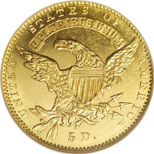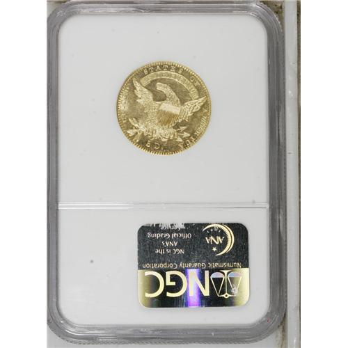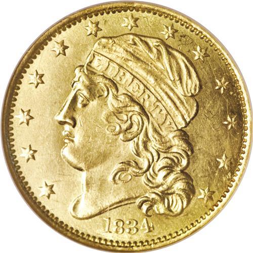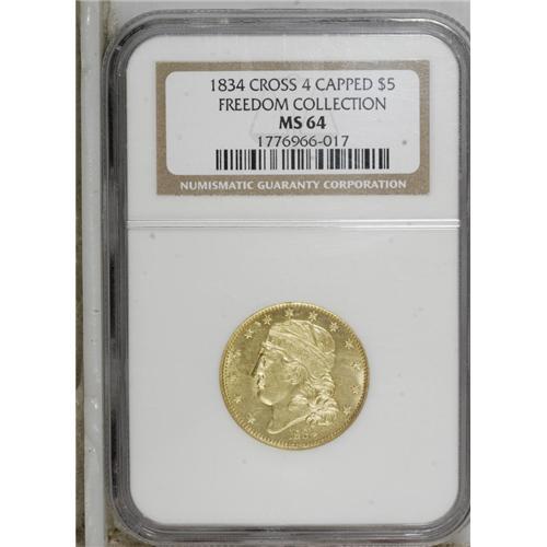 <B>1834 $5 Capped Head, Crosslet 4 MS64 NGC.</B></I> Ex: Freedom Collection. B. I-3, Breen-6500, Bass-3166, BD-2, R.5. The final "old tenor" design type was coined from 1829 through early 1834, with few surviving examples. Although Mint records suggest that more than 700,000 of these coins were produced from 14 different die combinations, the total estimated population today is less than 400 coins with a cumulative total of 284 to 370 pieces according to John Dannreuther, including 80 to 100 examples of this date alone. Some numismatists will be surprised to learn that the 1834 With Motto half eagle is the most plentiful date of this design type.<BR> The actual mintage figures have no relationship to the rarity of these pieces today. Newly minted half eagles during the 1820s and early 1830s were immediately worth a premium, and were hoarded and melted in this country, or exported. In the <I>Harry W. Bass, Jr. Sylloge,</B></I> Dave Bowers relates: "Beginning by the autumn of 1821, virtually all half eagles were exported, a situation that remained in effect through the summer of 1834. Even the Philadelphia Mint would pay a premium over face value for contemporary half eagles! Thus, striking was specifically to the order of bullion depositors who realized that a freshly-minted $5 would be worth more than face value, and that on the international market it could be exchanged for its bullion value. At foreign destinations such as London and Paris, American half eagles would be melted and converted into national coinage--to facilitate exchange, accounting, and trade. Although hundreds of thousands of Type IV 1813-1829, Type V was issued from 1829-1834 half eagles were struck, only a few survived exportation and subsequent melting. Thus, the general mintage figures in no way relate to the availability of such pieces today."<BR> The Coinage Act dated June 28, 1834 reduced the authorized weight of half eagles to 129 grains of standard 899.2 fine gold. The previous standard had been 135 grains of 916.7 fine gold. These standards yielded a gold value of $5.33 for the old standard pieces. The new standard, accompanied by the new Classic Head design, took effect on August 1, 1834. It is fascinating to learn that the most prolific private gold manufacturer in the country at that time, Christian Bechtler, adapted the new standard to his coinage as well. In fact, one of the Bechtler five dollar gold pieces actually includes the August 1, 1834 date as part of the design. The Bechtler piece actually contains 116.67 grains of pure gold instead of 116 grains, about three cents' worth of extra gold at the time.<BR> Although the 1979 photograph makes plate matching difficult, we are quite certain that this example is from the famous Garrett Collection, sold on behalf of Johns Hopkins University by Bowers and Ruddy in a series of four sales from 1979 to 1981. A tiny rim bruise directly above star 7 appears to match the photo of the Garrett coin. Despite a few insignificant abrasions, this is a lovely example with bright greenish yellow-gold color and full prooflike surfaces. The obverse has a die crack joining stars 9 through 13. John Dannreuther described different die cracks for his Die State b, but the other crack from the rim to cap at the right side of star 6 is not visible on this piece. The reverse has a crack through MERICA and the denomination.<BR><I>Apparently Ex: John W. Haseltine (69th Sale, 6/1883); Garrett Collection; Johns Hopkins University (Bowers and Ruddy, 11/1979), lot 477.</B></I><BR><BR><b>Shipping:</b> Coins & Currency (<a target="_blank" href="http://www.heritageauctions.com/common/shipping.php">view shipping information</a>)