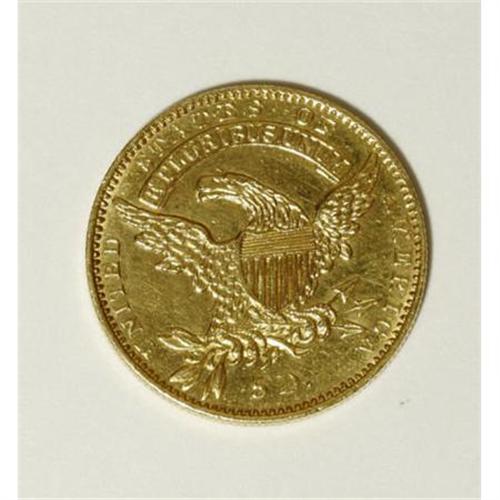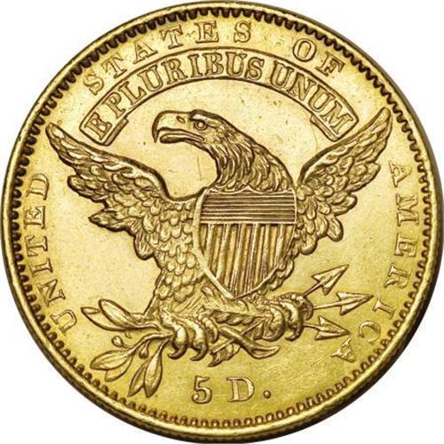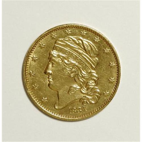 <B>1834 $5 Capped Head, Crosslet 4 MS60 Scratched, Cleaned Uncertified.</B></I> Breen-6500, BD-2, R.5. The 1834 Capped Head is many times rarer than its Classic Head half eagle counterpart. Only 50,000 pieces were struck for the former, while the latter had a mintage of more than 650,000 pieces. More importantly, a high percentage of Capped Head pieces were melted, since their bullion content exceeded face even as they fell from the dies. Survivors are further distributed among four different die marriages, two each with Plain and Crosslet 4 logotypes.<BR> This is a well struck piece that has only a hint of softness on the left shield border and the final star. Luster is subdued by a careful cleaning, but a thin diagonal scratch is noted on the left obverse field, along with a shorter, thin mark on the lower cheek. Often, a year or more passes between auction appearances of an 1834 Crosslet 4 Capped Head half eagle, and the opportunity to purchase such pieces is fleeting.<BR><BR><B>Coin Engraver:</B> John Reich<BR><BR><b>Shipping:</b> Coins & Currency (<a target="_blank" href="http://www.heritageauctions.com/common/shipping.php">view shipping information</a>)