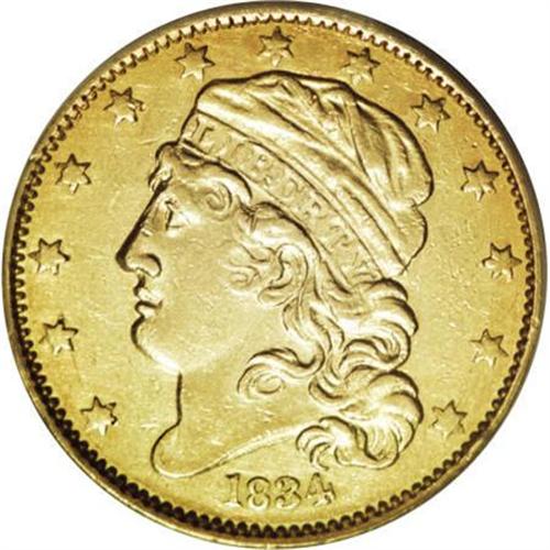<B>1834 $5 Capped Head, Crosslet 4--Graffiti, Cleaned--ANACS. AU50 Details.</B></I> Breen-6500, BD-2, R.5. Extremely light graffiti is visible in the left obverse field, and the surfaces on both sides show light hairlines and abrasions from cleaning. This otherwise attractive half eagle has bright green-gold surfaces with faint traces of orange toning. Few of these pre-Classic Head pieces have survived, and even those examples with minor problems remain highly desirable.<BR><I>From The John Stimson, Sr. Collection, Part One.</B></I><BR><BR><B>Coin Engraver:</B> John Reich<BR><BR><b>Shipping:</b> Coins & Currency (<a target="_blank" href="http://www.heritageauctions.com/common/shipping.php">view shipping information</a>)
