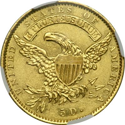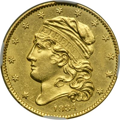 1834 $5 Classic Head. Plain 4. . BD-1, Breen-6499, variety with low 5D. NGC graded MS-61. Very rare date. A coin with significant claims to a higher grade. This coin's exacting strike is enhanced royally by a uniform, finely frosted luster of the greatest beauty and delicacy. Magnification and close scrutiny may find a mark or two along with some granular contact marks on the reverse, but none of this counts as a significant demerit or visual distraction. Here is a lustrous, eminently desirable instance of the final date of this Capped Head, No Motto type, combining outstanding characteristics with significant rarity for magnificent effect. Despite a coinage total of 50,141 pieces, the 1834 Capped Head Left issue is today very rare. Most specimens were melted due to the reduction of fineness/gold content marked by the change to the Classic Head type. Perhaps no more than 30 to 40 exist in all grades of the Plain 4, spread among (and permanently locked away in) the largest "name" collections in America. Pop 1; 3 in 62; 5 in 63; 2 in 64. In a new NGC 4 pronged holder.
