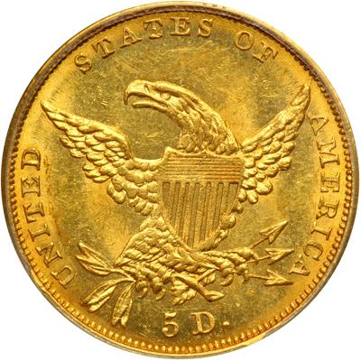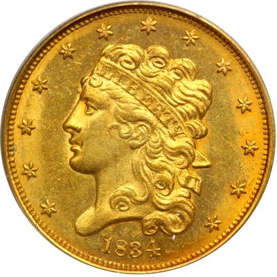 1834 $5 Classic Head. Plain 4. PCGS graded MS-63. Nicely toned with semi reflective surfaces. The satiny orange-gold surfaces reveal touches of vibrant gold frost in the hair and on a cheek that is nearly devoid of abrasions. Only a few light marks in the field limit the grade. The surface originality appears to extend complete around the circumference of both sides and all the way from the edge into the centers. Impressive in any condition, the 1834 Plain 4 version of William Kneass's beautiful design of 1834-38 is perhaps the single most popular 19th century gold half eagle issue. Something special to hold and admire for hours on end in the privacy of your study. Pop 51; 43 finer; 40 in 64; 2 in 65; 1 in 66. (PCGS # 8171).