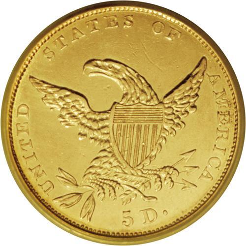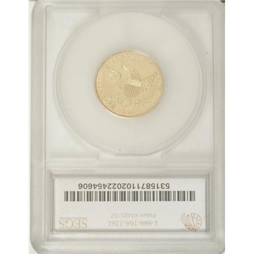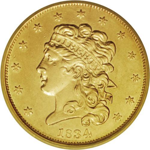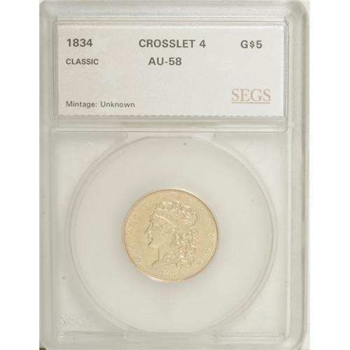 <B>1834 $5 Crosslet 4 AU55 SEGS (AU55 Cleaned).</B></I> Second Head, Breen-6503, McCloskey 5-D, R.4. The Crosslet 4 is the premier rarity in the short-lived series of Classic fives. Its mintage is unknown, since it was included in the total mintage for 1834 of 657,460 pieces. This rarity is almost never located in mint condition and AU coins are generally the finest obtainable. The surfaces on this piece are bright from cleaning, yet there is a trace of luster still visible around the peripheries. The striking definition is remarkably strong with the only area of softness on Liberty's uppermost hair curls. There are no obvious abrasions on either side.<BR><BR><b>Shipping:</b> Coins & Currency (<a target="_blank" href="http://www.heritageauctions.com/common/shipping.php">view shipping information</a>)