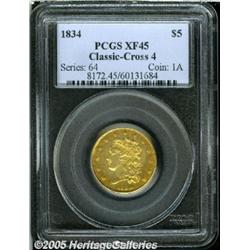 <B>1834 $5 Crosslet 4 XF45 PCGS.</B></I> No Motto, Second Head, Breen-6503, McCloskey 5-D, R.4. A very desirable XF representative of this rare variety, both sides are richly colored in original reddish-gold and orange colors. The well defined surfaces are moderately abraded, but no more so that one should expect for a Half Eagle that saw 15 points of wear.