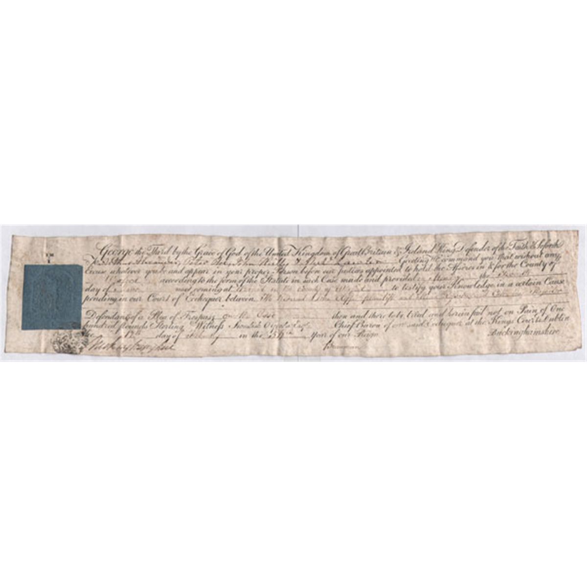 Signature on an envelope sent from Limerick to Strabane of Lord Chief Baron Standish O'Grady, member of the prosecuting counsel at the trial of Robert Emmet. Also with King George III summons issued for trespassing at Wexford with Standish O'Grady noted as Chief Baron. (2 items)