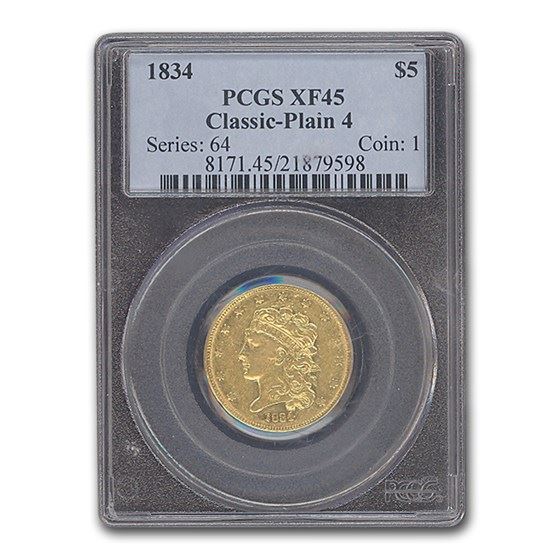 One piece 1834 $5 Gold Classic Head Half Eagle Plain 4 XF-45 PCGS