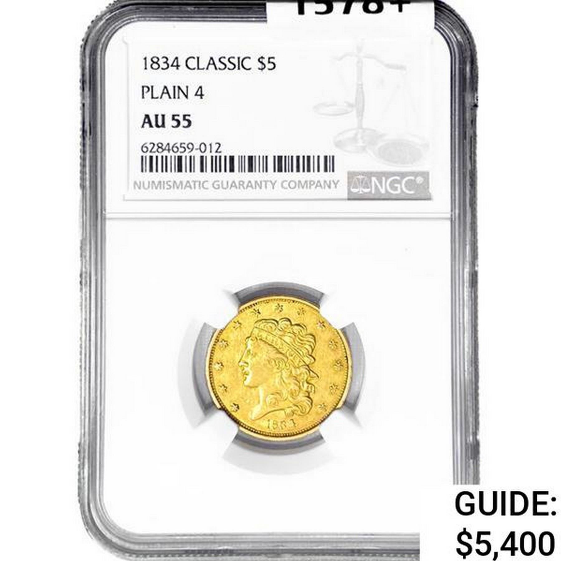 1834 $5 Gold Half Eagle NGC AU55 Plain 4