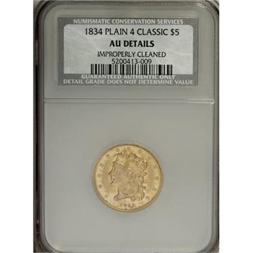 <B>1834 $5 Plain 4--Improperly Cleaned--NCS. AU Details.</B></I> NGC Census: (0/0). PCGS Population (0/0). Mintage: 657,460. (#8171)<BR><BR><B>Coin Engraver:</B> William Kneass<BR><BR><b>Shipping:</b> Coins & Currency (<a target="_blank" href="http://www.heritageauctions.com/common/shipping.php">view shipping information</a>)