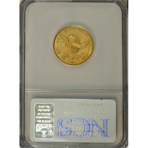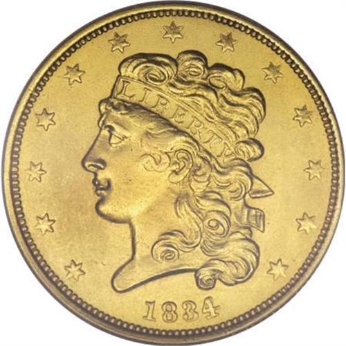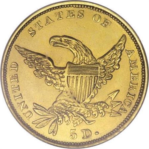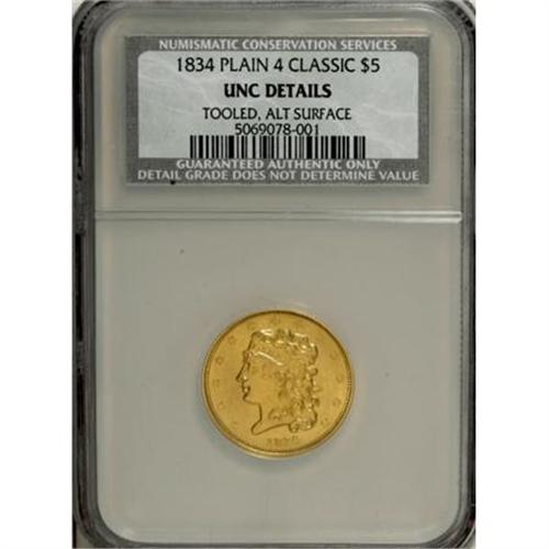 <B>1834 $5 Plain 4--Tooled, Altered Surface--NCS. Unc. Details.</B></I> Second Head, Breen-6502, McCloskey 2-A, R.2. The 4 in the date is triple punched, with a script 8, the eagle has a tongue, and the 5 in the denomination is halfway under the fletchings. This piece appears to have had the obverse hair strengthened a bit, and a small patch in the left obverse field shows tool marks where some deficit was effaced. Much appeal remains, however. While the luster is largely absent, the surfaces are free of abrasions and show a typical strike for the issue. <BR><BR><BR><B>Coin Engraver:</B> William Kneass<BR><BR><b>Shipping:</b> Coins & Currency (<a target="_blank" href="http://www.heritageauctions.com/common/shipping.php">view shipping information</a>\)