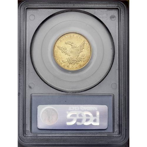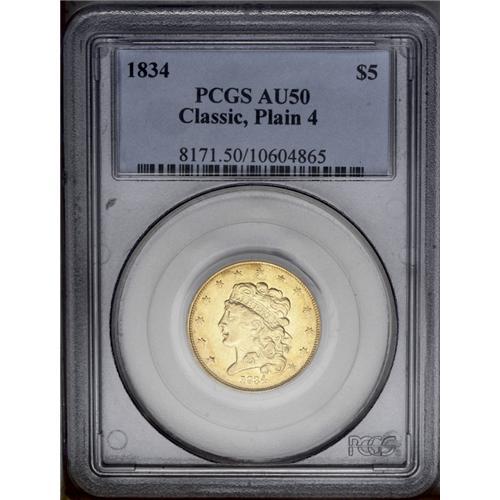 <B>1834<$5> Plain 4 AU50 PCGS.</B></I> Second Head, Breen-6502, McCloskey 4-C, R.3. A honey-gold piece that possesses ample remaining luster, and benefits from the absence of detrimental marks. A small retained lamination is found near the T in UNITED. <BR><BR><B>Important notice:</B> Heritage usually auctions material at the rate of 200-250 lots per hour. On some occasions eBay Live bid software or the Internet may not be able to keep up with the pace of the auction. We recommend placing a realistic absentee bid now as insurance to avoid disappointment. Occasionally the auctioneer may eliminate or reject an eBay Live bid, and the auctioneer may also reopen a lot after the close of the eBay live bidding (usually because we missed an audience bid), and may reject your bid even if it shows you as the winning bidder. By bidding via eBay Live, you agree that Heritage may award the lot to another bidder at its sole discretion under the circumstances described above or any other reasonable circumstances. Since eBay bids are not shown to us until we open the lot on the floor, we treat those bids just like floor bids. In most cases the floor responds before the eBay bid is presented to us, due to Internet lag time, so for consistency we have made it a policy that floor bids are always considered first over tie eBay live bids. Also please note that all Heritage lots purchased through eBay Live carry a 20% Buyer's Premium. Please make sure you read the Terms and Conditions before you bid. This lot is being auctioned in conjunction with a live floor auction by Heritage Galleries & Auctioneers. All final auction and invoice information will be supplied by Heritage Galleries & Auctioneers, and all other information should be considered preliminary. Lot:2638 <BR><BR><B>Winning Notification and Billing:</B> After the FINAL session in this auction is complete, Heritage will send e-mail and snail mail invoices. This process normally takes several days. All final auction and invoice information will be supplied by Heritage Galleries & Auctioneers, and all other information should be considered preliminary. <BR><BR>This auction will be conducted on a live auction floor and over the Internet through eBay Live. If you choose to place an absentee bid, please take a moment to <font color='#0000ff'><u><a href='http://pages.ebay.com/liveauctions/help/before/laabsentee.html'>learn how eBay Live absentee bidding works</a></u></font><font color='#000000'>