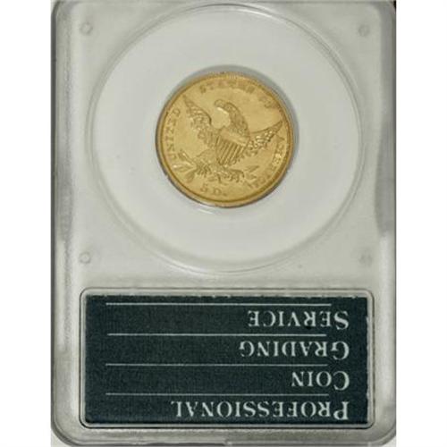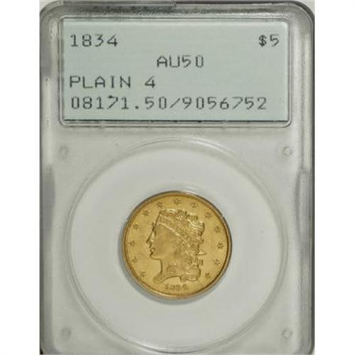 <B>1834 $5 Plain 4 AU50 PCGS.</B></I> First Head, Breen-6501, McCloskey 3-A, R.3. Much original luster survives and a tinge of reddish patina combines with the green-gold alloy. As often seen on this die marriage, a spindly die crack drops from Liberty's eye and another connects her lowest curl to the border at 5 o'clock.<BR><BR><BR><B>Coin Engraver:</B> William Kneass<BR><BR><b>Shipping:</b> Coins & Currency (<a target="_blank" href="http://www.heritageauctions.com/common/shipping.php">view shipping information</a>\)