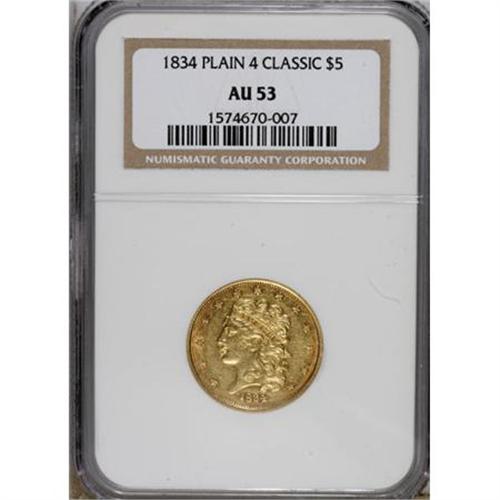 <B>1834 $5 Plain 4 AU53 NGC.</B></I> First Head, Breen-6501, McCloskey 1-A, R.3. Well struck for the type, and wear is limited to friction on the eyebrow and curl highpoints. Clean, aside from a diagonal mark on the cheek.<BR><BR><b>Shipping:</b> Coins & Currency (<a target="_blank" href="http://www.heritageauctions.com/common/shipping.php">view shipping information</a>)