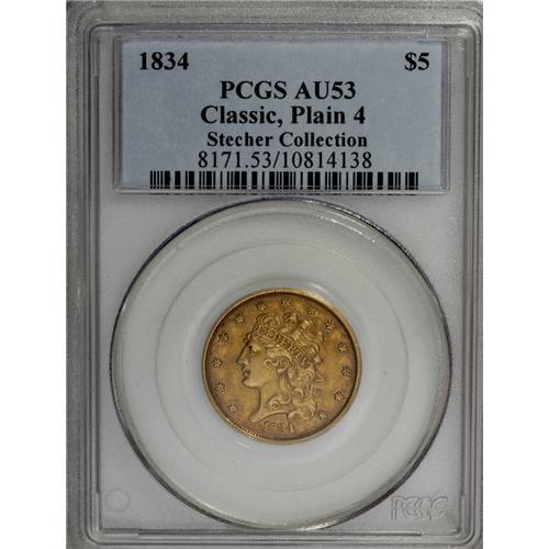 <B>1834 $5 Plain 4 AU53 PCGS.</B></I> First Head, Breen-6501, McCloskey 3-A, R.3. Unusually well struck, especially on the reverse. The somewhat muted surfaces display deep olive-orange toning and some grayish-lilac color near the borders. A shallow diagonal scratch is noted on Liberty's face, from near the corner of her mouth to the jawline. Purchased in the 1930's at face value by Karl Stecher Sr. from coins turned in by the public as per President Roosevelt's March 9, 1933 directive. An envelope accompanies, and has the notes "1835 Gold $5.00 Fine Plain 4 Classic head."<BR><I>From The Stecher Collection.</B></I><BR><BR><b>Shipping:</b> Coins & Currency (<a target="_blank" href="http://www.heritageauctions.com/common/shipping.php">view shipping information</a>)