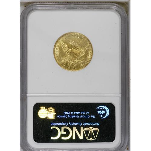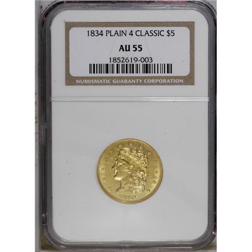 <B>1834<$5> Plain 4 AU55 NGC.</B></I> Breen-6502, McCloskey 2-A, R.2. Nicely struck with areas of original luster on each side. Light handling marks and abrasions appear in the yellow-gold fields.
