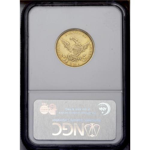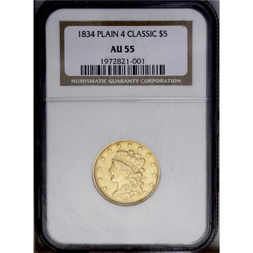 <B>1834<$5> Plain 4 AU55 NGC.</B></I> Second Head, Breen-6502, McCloskey 4-C, R.3. A moderately circulated apricot-gold example without noticeable marks. The field above the eagle's head is mildly granular. <BR><BR><B>Important notice:</B> Heritage usually auctions material at the rate of 200-250 lots per hour. On some occasions eBay Live bid software or the Internet may not be able to keep up with the pace of the auction. We recommend placing a realistic absentee bid now as insurance to avoid disappointment. Occasionally the auctioneer may eliminate or reject an eBay Live bid, and the auctioneer may also reopen a lot after the close of the eBay live bidding (usually because we missed an audience bid), and may reject your bid even if it shows you as the winning bidder. By bidding via eBay Live, you agree that Heritage may award the lot to another bidder at its sole discretion under the circumstances described above or any other reasonable circumstances. Since eBay bids are not shown to us until we open the lot on the floor, we treat those bids just like floor bids. In most cases the floor responds before the eBay bid is presented to us, due to Internet lag time, so for consistency we have made it a policy that floor bids are always considered first over tie eBay live bids. Also please note that all Heritage lots purchased through eBay Live carry a 20% Buyer's Premium. Please make sure you read the Terms and Conditions before you bid. This lot is being auctioned in conjunction with a live floor auction by Heritage Galleries & Auctioneers. All final auction and invoice information will be supplied by Heritage Galleries & Auctioneers, and all other information should be considered preliminary. Lot:2641 <BR><BR><B>Winning Notification and Billing:</B> After the FINAL session in this auction is complete, Heritage will send e-mail and snail mail invoices. This process normally takes several days. All final auction and invoice information will be supplied by Heritage Galleries & Auctioneers, and all other information should be considered preliminary. <BR><BR>This auction will be conducted on a live auction floor and over the Internet through eBay Live. If you choose to place an absentee bid, please take a moment to <font color='#0000ff'><u><a href='http://pages.ebay.com/liveauctions/help/before/laabsentee.html'>learn how eBay Live absentee bidding works</a></u></font><font color='#000000'>